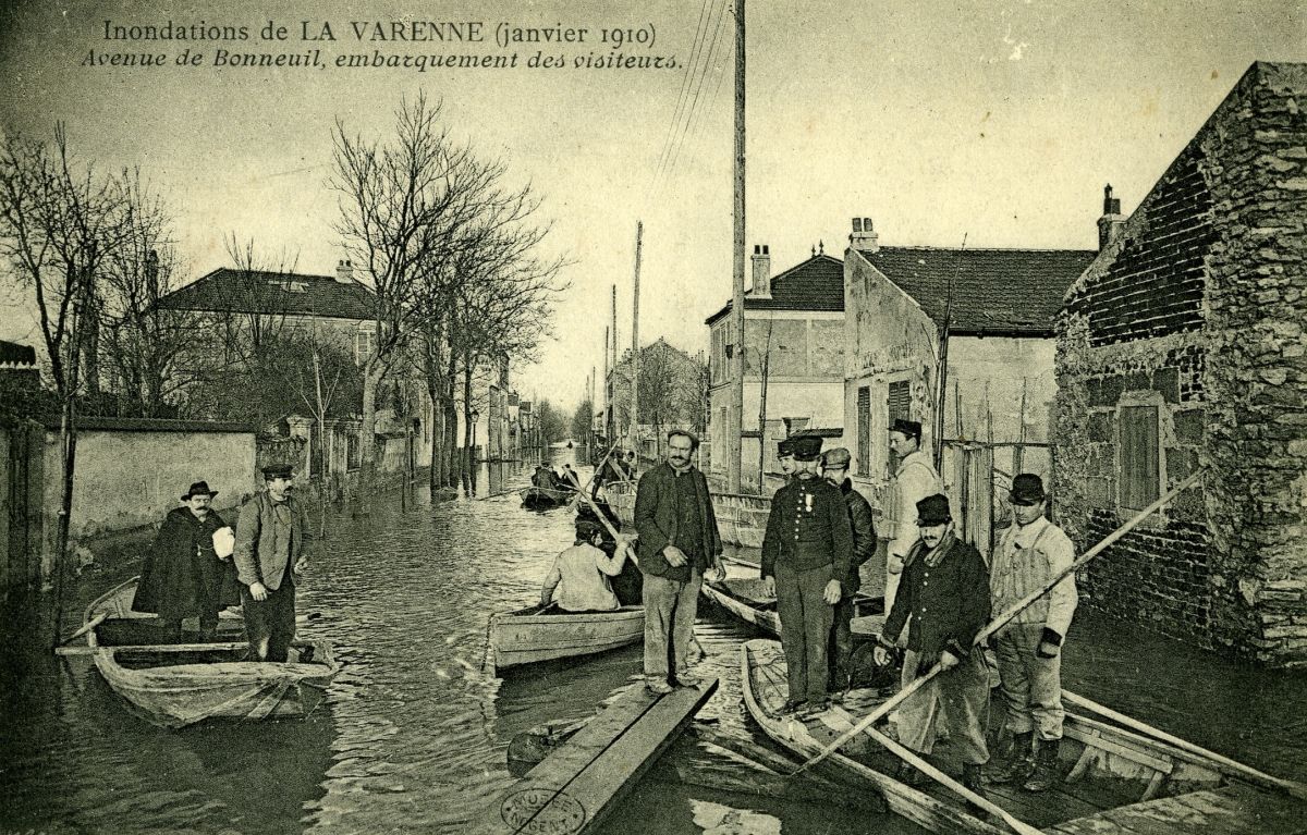 Inondations de la Varenne - Avenue de Bonneuil, embarquement des visiteurs