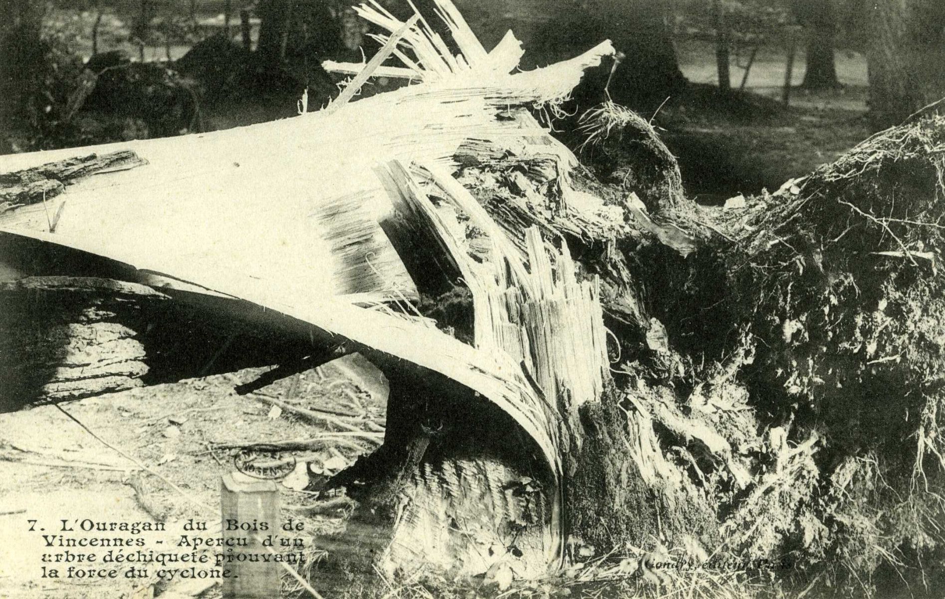 L'Ouragan du Bois de Vincennes - Aperçu d'un arbre déchiqueté prouvant la force du cyclone