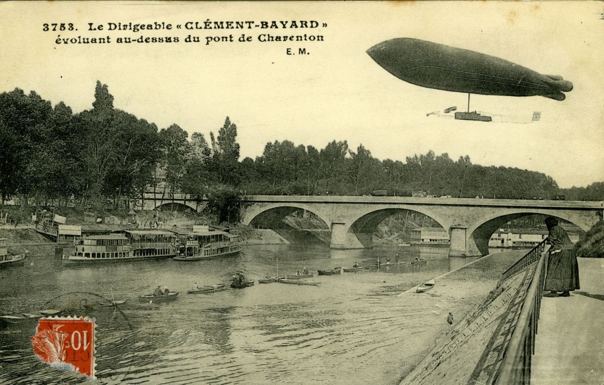 Le dirigeable "Clément-Bayard" évoluant au-dessus du pont de Charenton