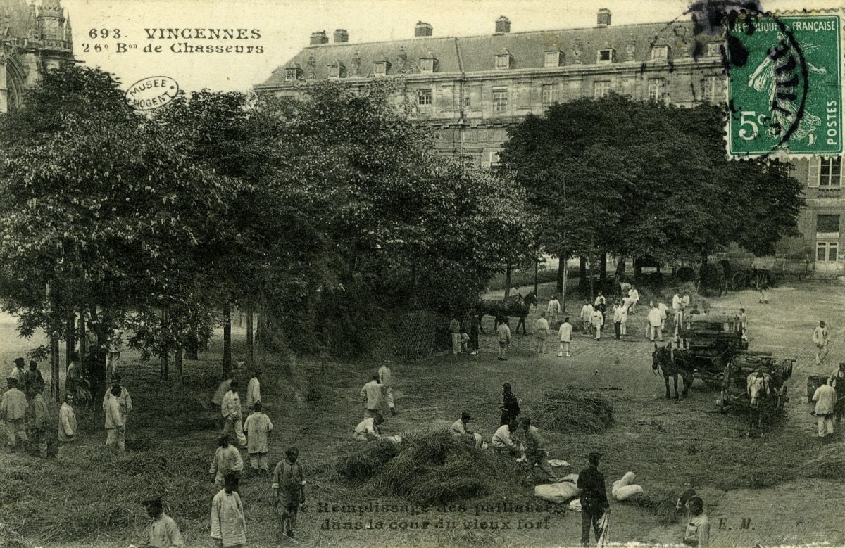 : Remplissage des paillasses dans la cour du vieux fort